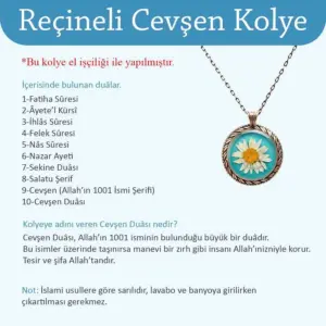 El işçiğiyle özenle yapılmış Madeni Bronz Reçine Kolye Cevşen, kurutulmuş gerçek çiçek ve gerçek ebrulu ve deniz yıldızlı desenleriyle sevdikleriniz için çok güzel bir hediye.
