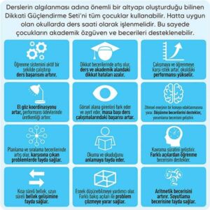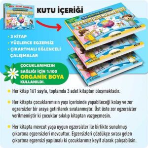 - Dikkati güçlendiren egzersizler çocuğun yaşına uygun olarak hazırlanmıştır.