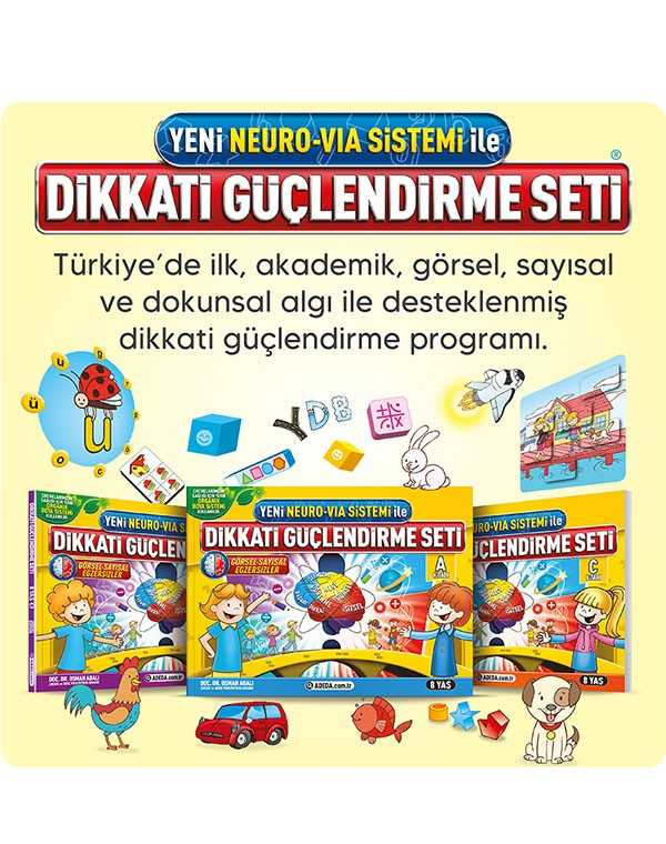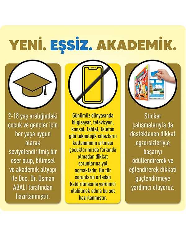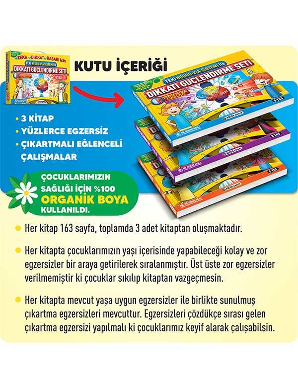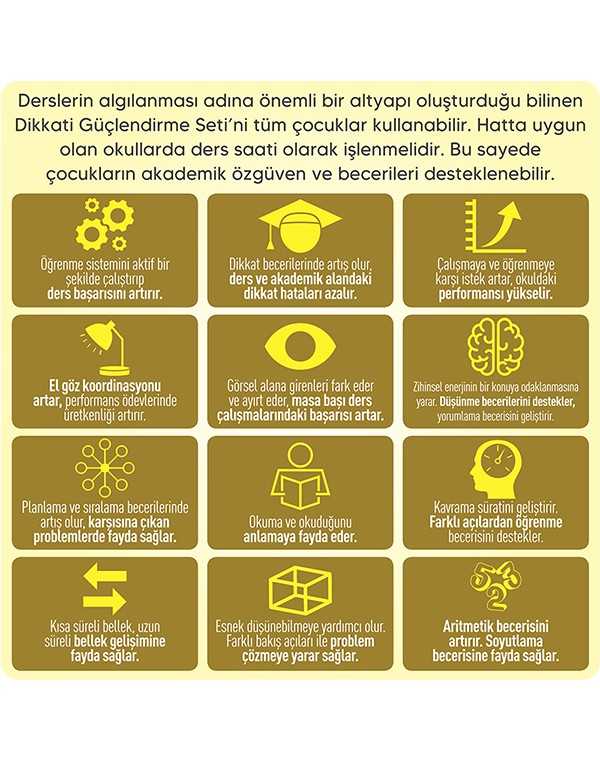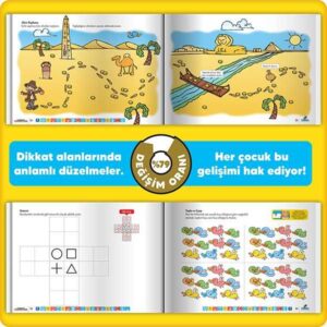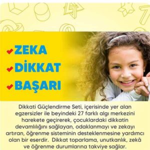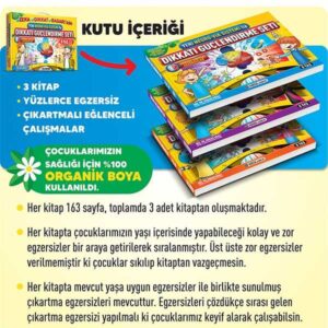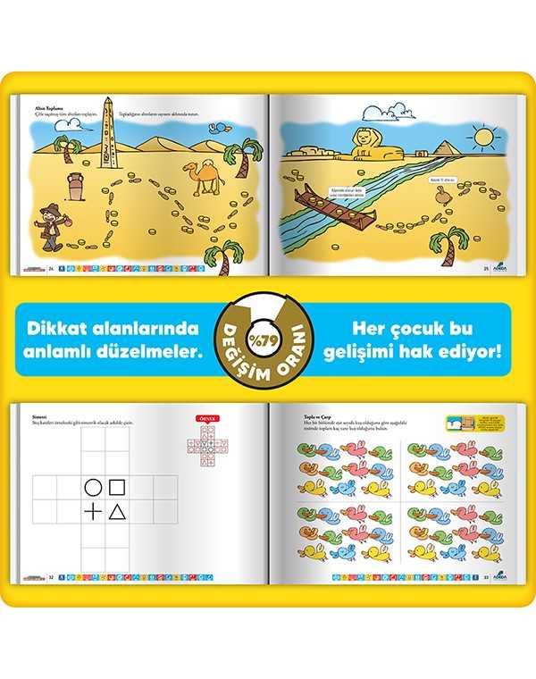 - Dikkati güçlendiren egzersizler çocuğun yaşına uygun olarak hazırlanmıştır.