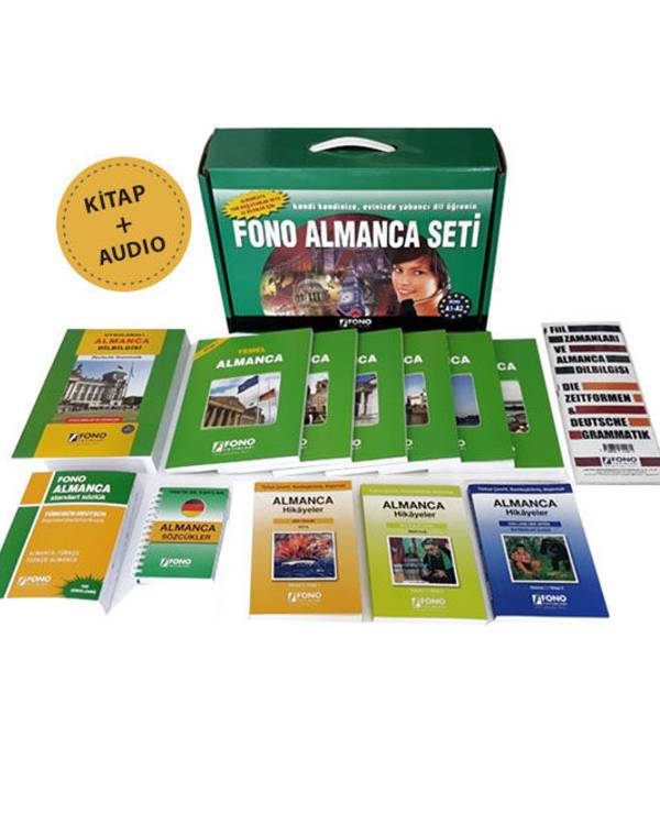 FONO Almanca Eğitim Seti Almancayı hiç bilmeyenler veya başlangıç seviyesinde (A1) bilgisi olanlara göre hazırlanmış olup, orta seviyeye (A2) ulaştırmaktadır. Seslendirmelere web sitesinden online olarak ulaşabilirsiniz.