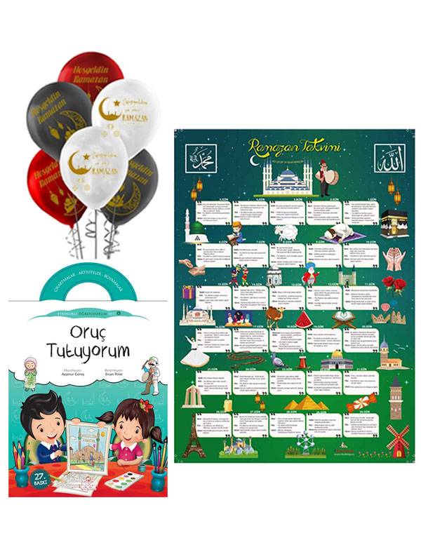 \n - 1 Adet Oruç Tutuyorum Etkinlik kitabı, 1 adet Ramazan Takvimi, 6 adet Balon karışık renkli toplam 3 adet ürün sette yer almaktadır.