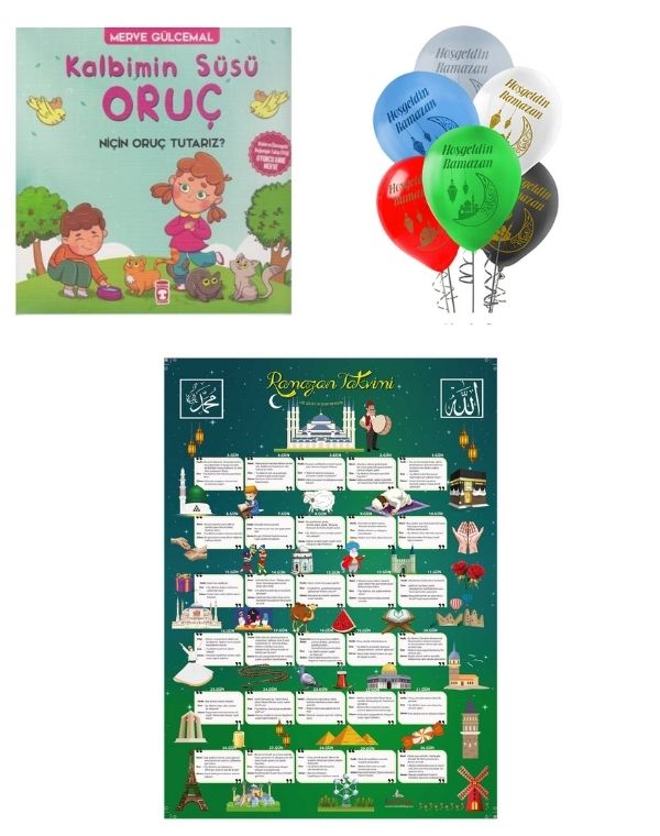 \n - 1 Adet Kalbimin Süsü Oruç kitabı, 1 adet Ramazan Takvimi, 6 adet Balon karışık renkli ve 1 adet Ramazan Süsü toplam 4 adet ürün sette yer almaktadır.